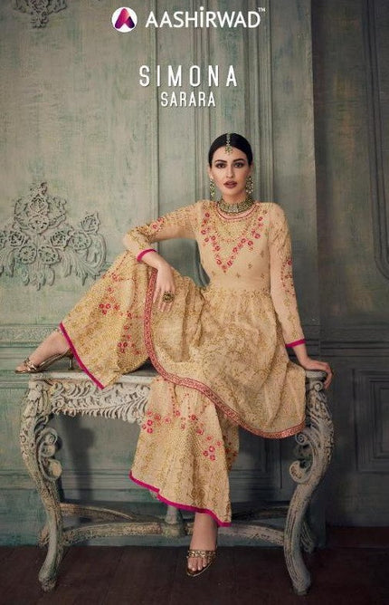 Catalog AASHIRWAD CREATION SIMONA SHARARA Pcs 6 AVG. Price 2295 Full Price 13770 Size Unstitched   Fabric Details Top- Real Georgette Bottom – Real Georgette free size stitched. Duptta .. Narzling