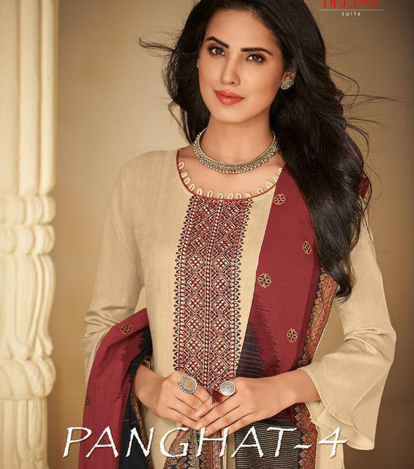 Catalog DEEPSY PANGHAT VOL 4Pcs 8AVG. Price 750Full Price 6000Size Unstitched Fabric DetailsTop – Pure Pasmina Print With Heavy Self EmbroideryBotttom – Pasmina solid 2.70 MtrsDupatta – Pasmina Foil Print Box Pallu with...