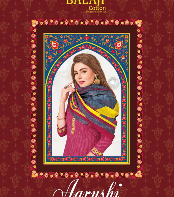 Catalog Balaji Cotton AarushiPiece 16Rate of PEr pc 360Price 5760Size UnstitchedFabric Pure CottonTop Cotton | 2.50 Mtrs Bottom Cotton | 2.00 MtrsDupatta Malmal Pure Heavy Dupatta | 2.25 Mtrs