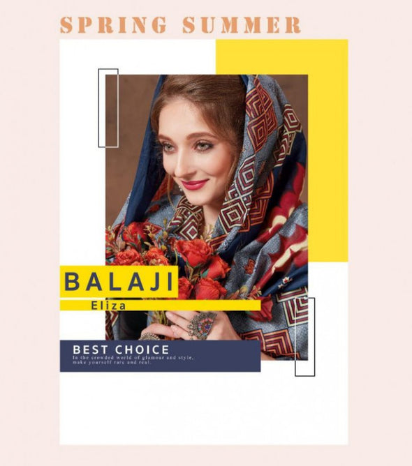 Catalog BALAJI ELIZA VOL 3Pcs 10AVG. Price 475Full Price 4750Size Unstitched* Fabrics details* Rayon 14 kg Top 2.50** Pure Havy cotton Salwar 2.50** Havy cotton duppta Malmal*