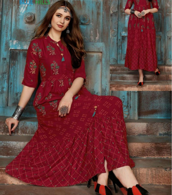 NAME - BH-Bournville-2 Rayon And Foil Print Kurtis SellerAVG. RATE - 600FULL CATALOG RATE- 6000WEIGHT - 5 KGTYPE - KurtisMOQ - Minimum 10 Pcs.BRAND - Blue HillsFabric - Heavy Rayon With Foil Print | Length:52"