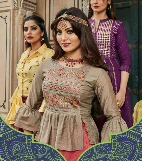 AME:Mittoo-Darpan Rayon With Work Designer Kurtis Online MarketAVG. RATE :470FULL CATALOG RATE :3760WEIGHT :4 KGTYPE :KurtisMOQ :Minimum 8 Pcs.BRAND :MittooSize :M, L, XL, XXL, 3XL,Fabric :Heavy Rayon With Mirror HandWork