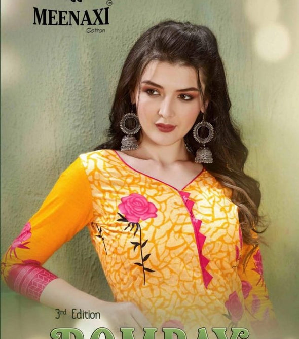 Meenaxi Bombay Cotton Third EditionPrice Per Piece: 250 INR Minimum Order Quantity: 10 PiecesFull Catalog Price: 2500 INR + GST@5%Fabric Details:- Top cotton 2.50 meter (approx)Bottom cotton 2.0 meter (approx)Dupatta cotton 2.25 meter (approx)