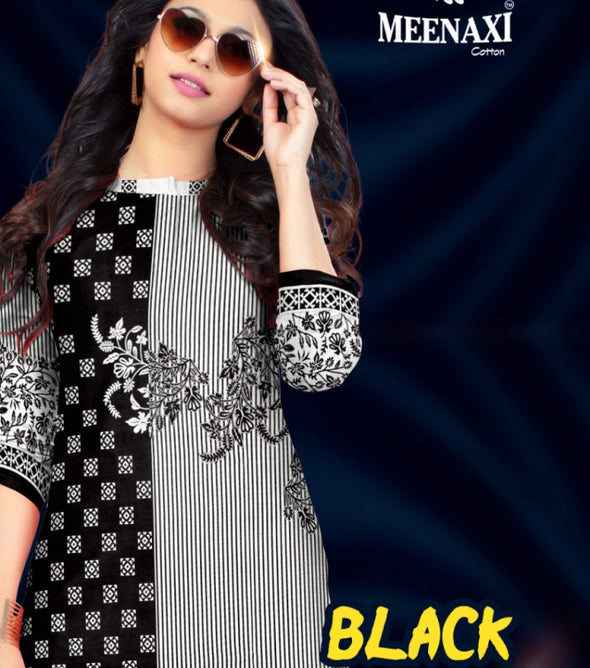 Catalog MEENAXI COTTON BLACK WHITEPcs 10AVG. Price 300Full Price 3000Size Unstitched Fabric 100gm CottonTop 2.35 MTBottom 2.00 MTDupatta 2.20