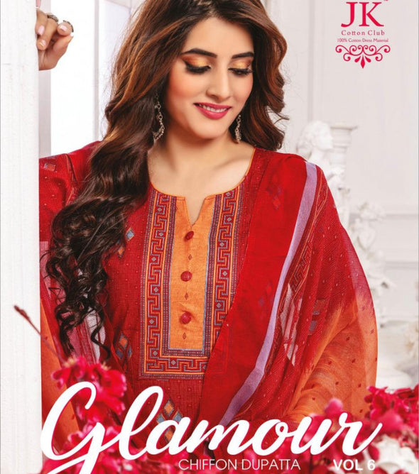 Catalog JK Glamour vol 6Piece 12Rate of Per pc 290Price 3480Size UnstitchedFabric Pure CottonTop Cotton | 2.50 Mtrs Bottom Cotton | 2.0 MtrsDupatta Chiffon | 2.25 Mtrs