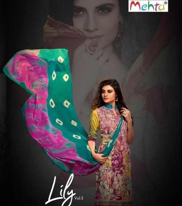 Mehta Lily vol 3 Price Per Piece: 400 INR Minimum Order Quantity: 08 Pieces Full Catalog Price: 3200 INR + GST@5% Fabric Details:- Top rayon cotton print 2.50 meter (approx) Bottom cotton plain 2.50 meter...