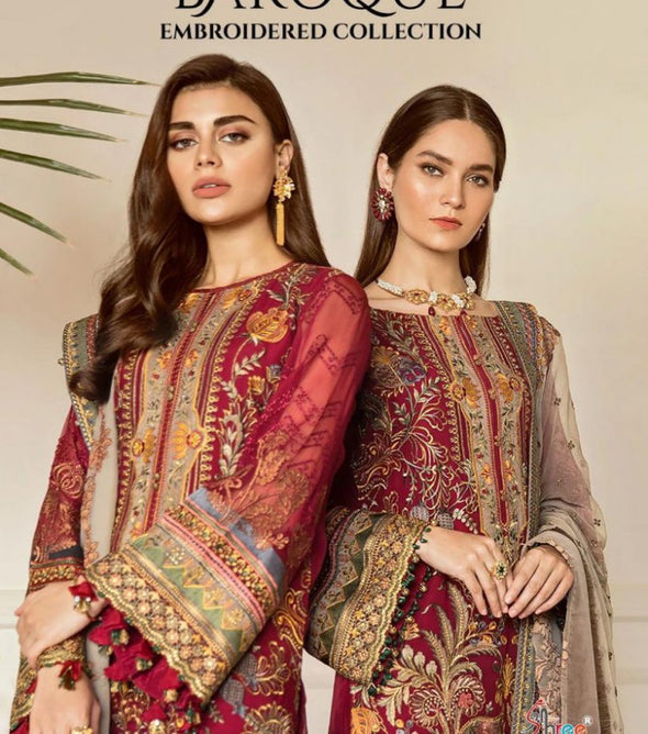 Catalog SHREE FABS BAROQUE Nx EMBROIDERED COLLECTIONPcs 2AVG. Price 1299Full Price 2598Size Unstitched,Fabric DetailsTOP HEAVY JORGET WITH EMBRODERYBOTTOM INNER SANTOONDUPPTA NET EMBRODERD
