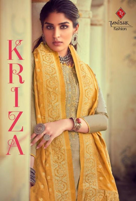 Catalog TANISHK FASHION KRIZAPcs 6AVG. Price 1095Full Price 6570Size UnstitchedFabric Description-KRIZA1-TOP:-Pure Jam satin with heavy embro work2-Bottom:-Pure Lawn3-Dupatta:- Banaras Jacard with weaving effect4-Special:-Jam with heavy work with jacard dupatta in best...