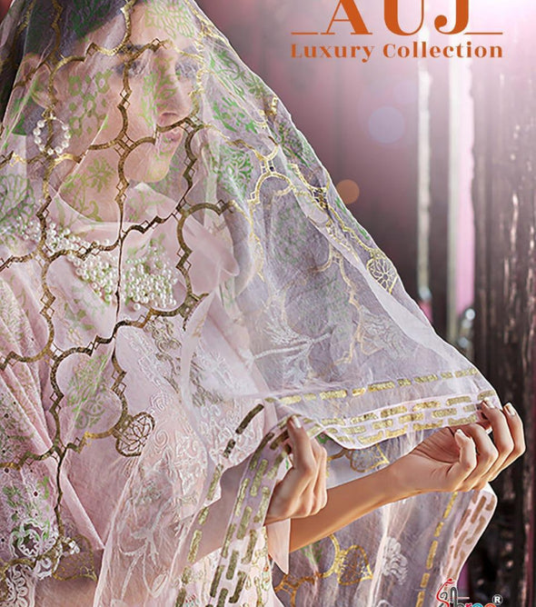 AUJ LUXURY COLLECTION TOP PURE COTTON LAWN PRINT WITH EXCLUSIVE EMBRODERY BOTTOM SEMILAWN PRINTED & DYEDDUPPTA D NO 1101 ORGANTA GOLD BLOCK PRINT D NO 1102 EMBRODERD NET D no 1103 TABBY SILK GOLD FOIL...