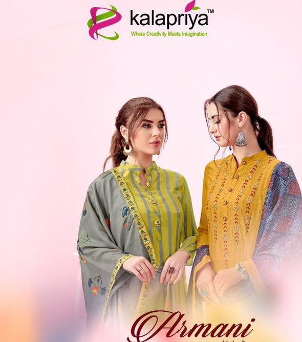 Catalog KALAPRIYA ARMANI VOL 3Pcs 6AVG. Price 895Full Price 5370Size Unstitched Fabric DetailsTop: pure rayon and Maslin digitalDupatta: Exclusive processed maslin digital print (2.35mtr)Bottom: pure santoon (2.5 mtrs)Quality Fabrics with exquisite designs at...