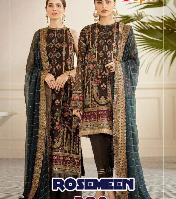 Catalog ROSEMEEN BRQPcs 8AVG. Price 1359Full Price 10872Size Unstitched,Fabric detailsTop : GEORGETTE/NETBottom/INNER- SANTOONDupatta : JAQUARD/ NET/ NAZMEEN