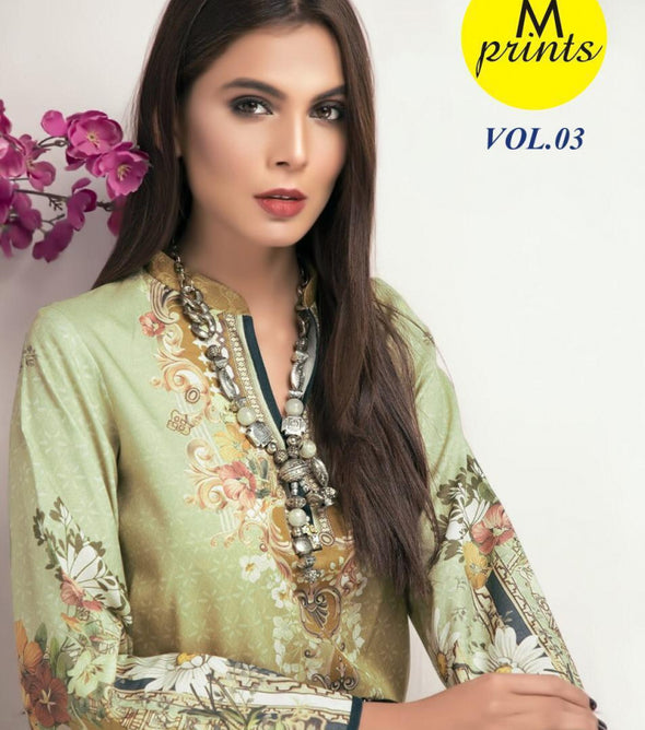Catalog M PRINTS VOL 3Pcs 8AVG. Price 315Full Price 2520Size Unstitched*Fabric Details:-Top:- Cotton Printed (2.25 Mtr)Bottom:- Cotton (2 Mtr)Dupatta:-Cotton Printed (2.25 Mtr)