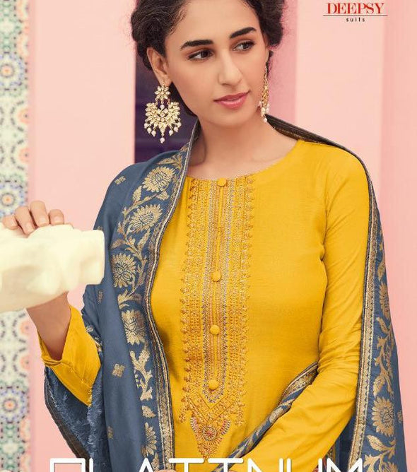 Catalog DEEPSY SUITS HEAVINPcs 5AVG. Price 999Full Price 4995Size UnstitchedFabric DetailsTop – Pure Viscose cotton silk With EmbroideryBottom – Dull santoonDupatta – Pure organza with embroidery Work