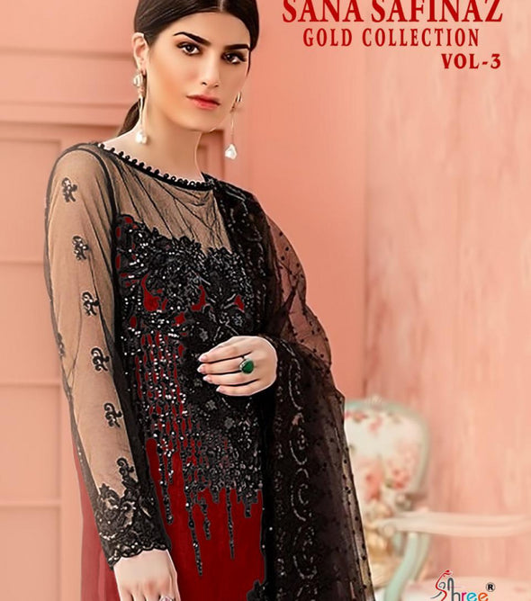 Catalog SHREE FABS SANA SAFINAZ GOLD COLLECTION VOL 3Pcs 4AVG. Price 999Full Price 3996Size Unstitched Fabric DetailsTOP BUTTER FLY NET WITH HEAVY EMBRODERYBOTTOM INNER SANTOONDUPPTA EMBRODERD NETDES 1 IN 4 COLOR