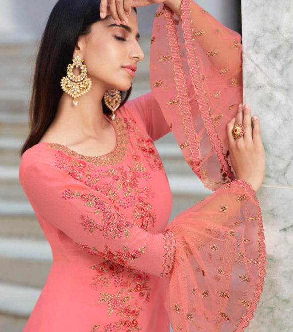 🍎DESCRIPTION:-RAJJO🍎✅✅✅✅✅✅✅✅✅✅✅1-TOP:-Pure Satin Gorgette silk long suit With heavy work & handwork with Dull santun inner2-Bottom:-Gorgette Ghaghra with full all side work &santun inner&*Extra bottom material **3-Dupatta:-Soft pure chinon silk with heavy dupatta work with four...