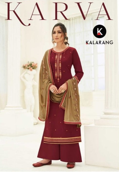 Catalog KALARANG KARVAPcs 4AVG. Price 799Full Price 3196Size UnstitchedFabric DetailsTop:- Jam Silk Cotton with Embroidery WorkBottom:- Reyon (Cut:-2.70)Dupatta:- Nazneen With 3mm Sequence With Brocade Border
