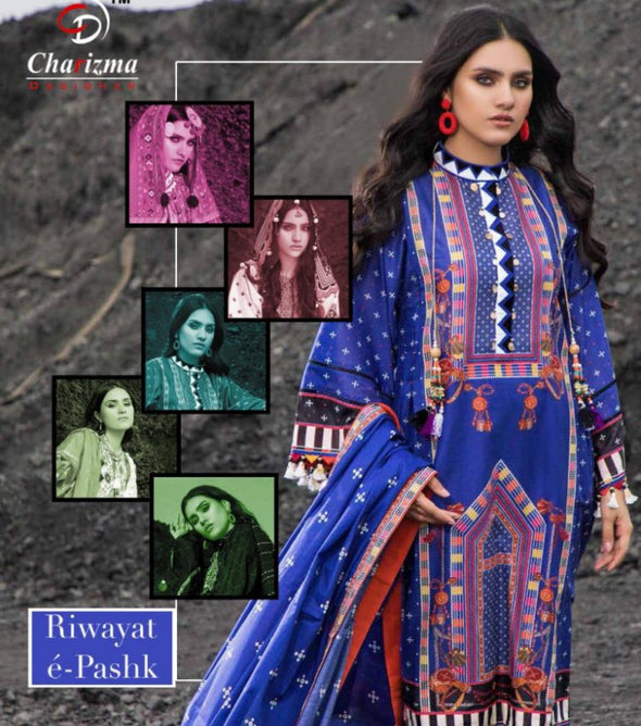 Catalog CHARIZMA RIWAYAT E PASHK GUL AHMEDPcs 5AVG. Price 899Full Price 4495Size UnstitchedFabric DetailsTop:-Havey JAAM COTTON With PATCH Embroidery & Bunch PatchesBottom:-Pure Cotton With Patch WorkDupatta:- TABBY SILK Digital Print